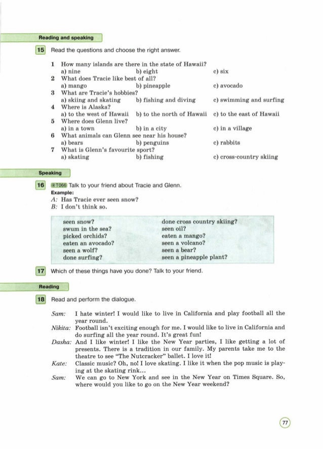 Даша:А я люблю зиму.Мне нравятся новогодние вечеринки,я люблю получать много подарков.В нашей семье есть традиция.Мои родители отвозят меня в театр на Щелкунчика.Мне он нравится.