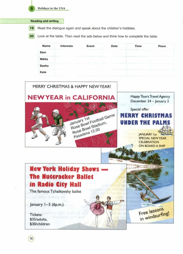 Сэм:Мы можем отправиться в Нью-Йорк и встретить Новый Год на Таймс Сквер.Так что,куда бы вы хотели отправиться на новогодние каникулы?