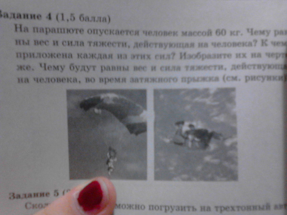 На парашюте опускается человек массой 60 кг, чему равных вес и сила тяжести, действующая на человека? К чему приложена каждая из этих сил? Чему будут равны вес и сила тяжести, действующая на человека, во время затяжного прыжка (см. Рисунок)