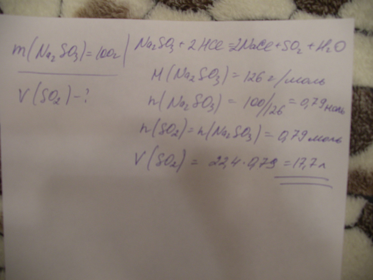 При взаимодействии 100 г сульфита натрия с раствором соляной кислоты образуется сернистый газ при (н.у) объемом __________л.