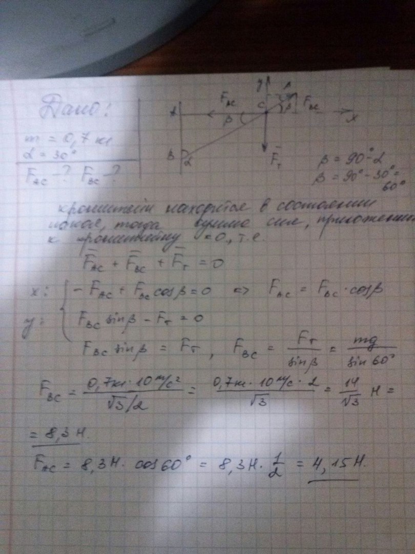 К кронштейну ABC подвешен груз массой 0,7 кг Угол α = 30°. Определить силы упругости в стержнях ВС и АС