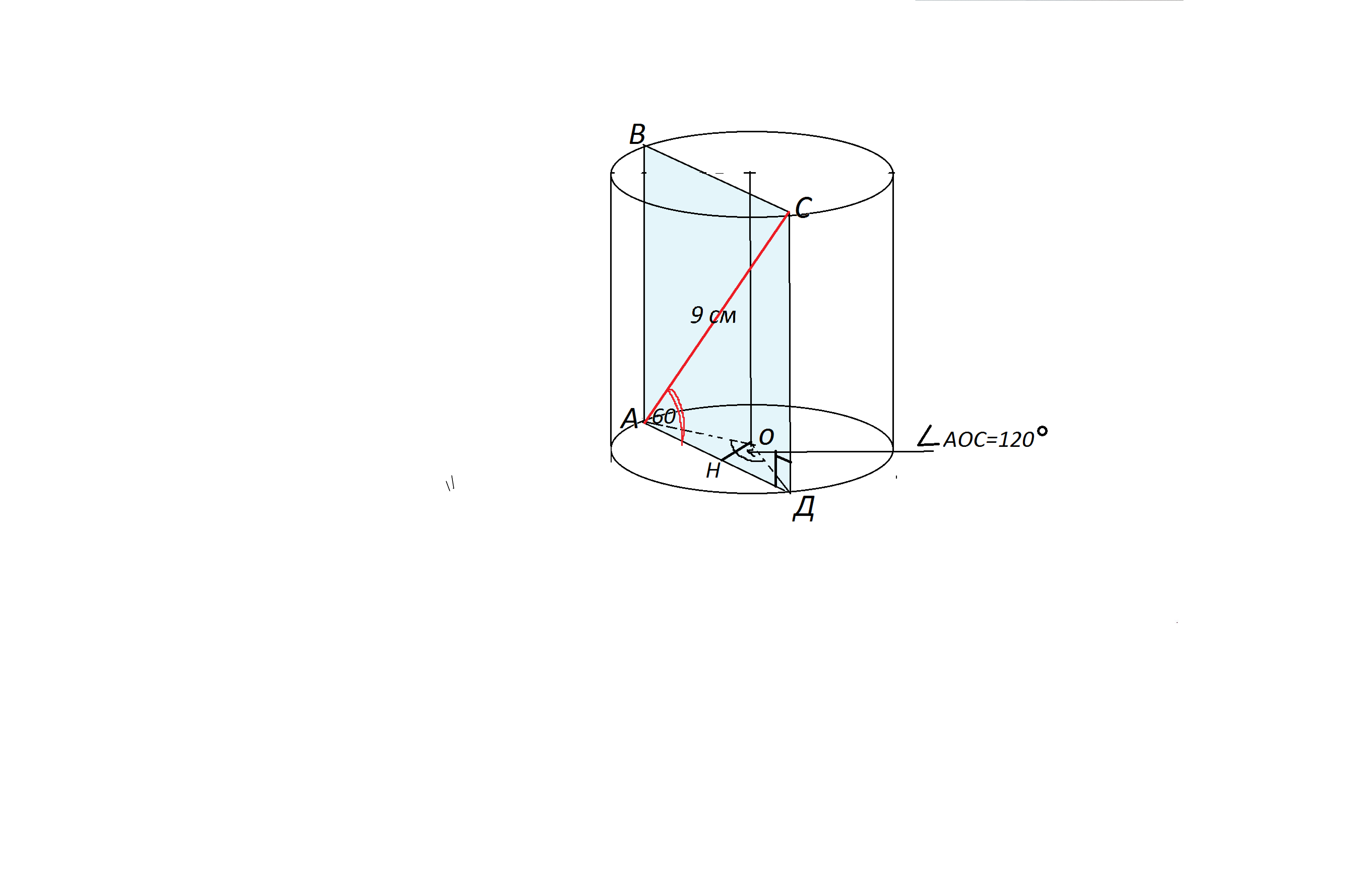 Диагональ сечения цилиндра, параллельного оси равна 9 см и наклонена к плоскости основания под углом 60 градусов. найдите площадь полной поверхности цилиндра если в основании цилиндра отсекается дуга 120 градусов