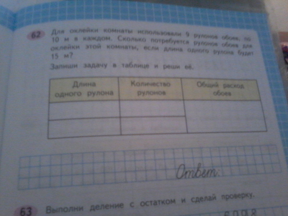 для оклейки комнаты использовали 9 рулонов обоев, по 10 м в каждом. Сколько потребуется рулонов обоев для оклейки этой комнаты, если длина одного рулона будет 15 м? Запиши задачу в таблице и реши её.