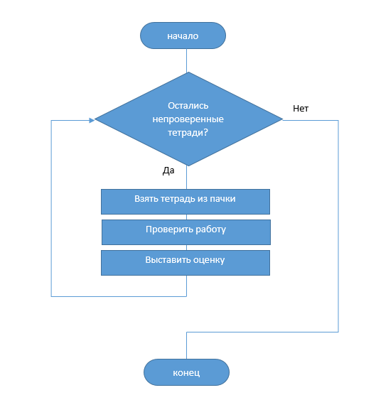 Помогите пожалуйста, буду благодарна. очень нужно))) Нарисуйте ориентированный граф ( блок - схему) проверки учителем пачки тетрадей. В систему команд входит : проверить работу; взять тетрадь из пачки; выставить оценку; выяснить, остались ли ещё не проверенные тетради. Содержит ли полученный граф цикл?