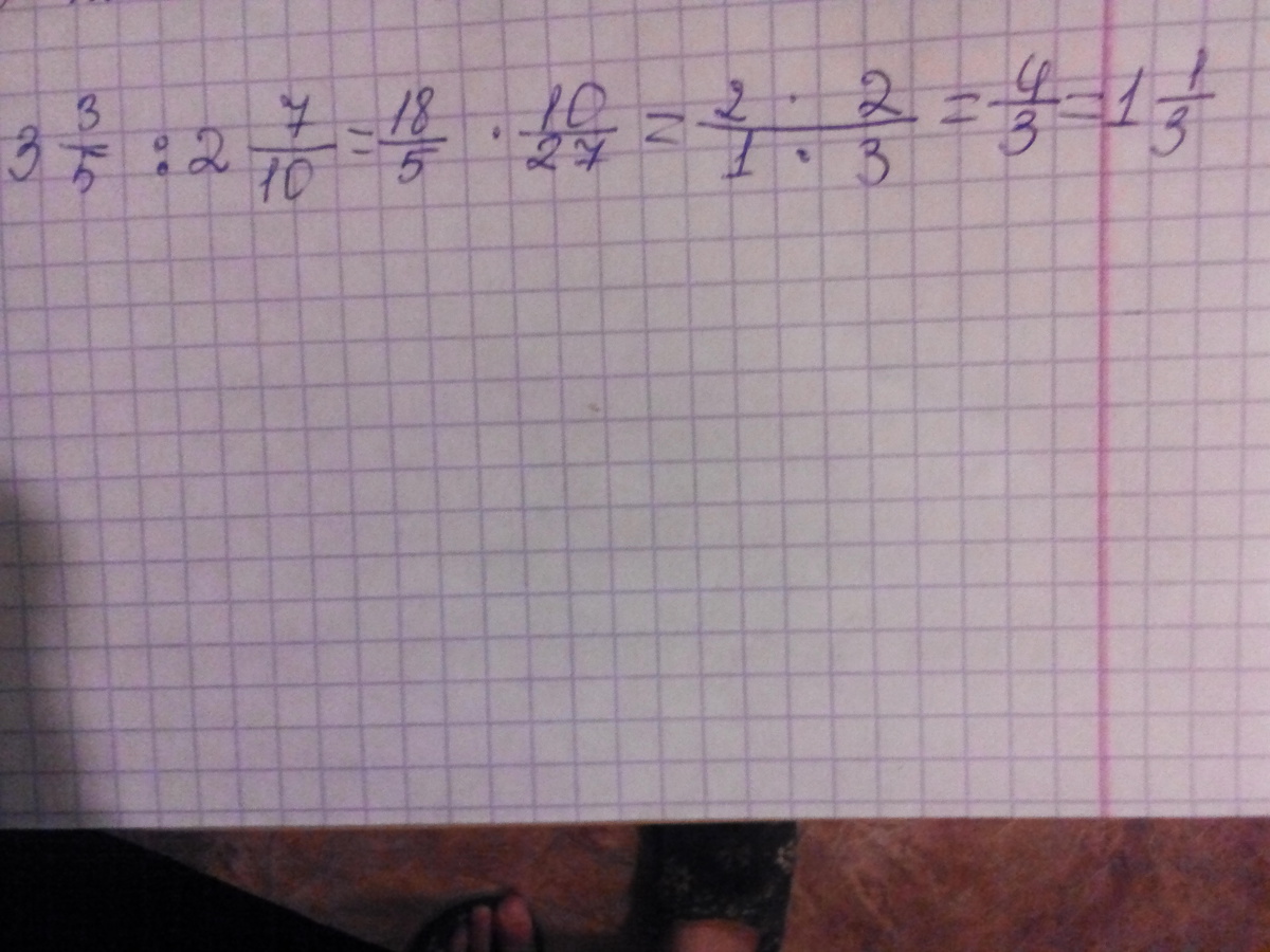 3 целых 3/5 : 2 целых 7/10 = 18/5 : 27/10 = 18/5 * 10/27 = 4/3 = 1 целая 1/3