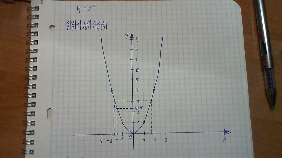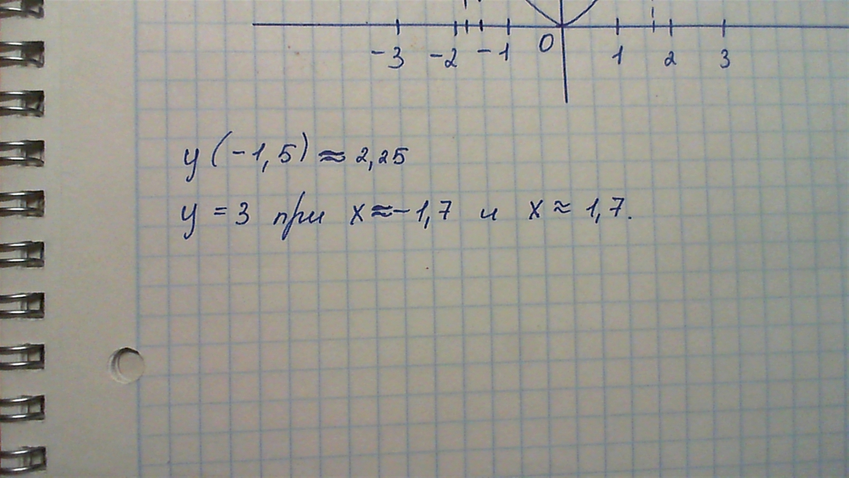 Постройте график функции y=x во 2 степени . С его помощью определите: а) значение функции ,при значении аргумента , равному -1,5 ; б) значения аргумента , при которых значение функции равно 3
