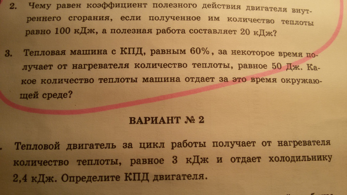 Чему равен коэффицент полезного действия двигателя внутреннего сгорания, если полученное им количество теплоты равно 100 кДж, а полезная работа составляет 20 кДж?