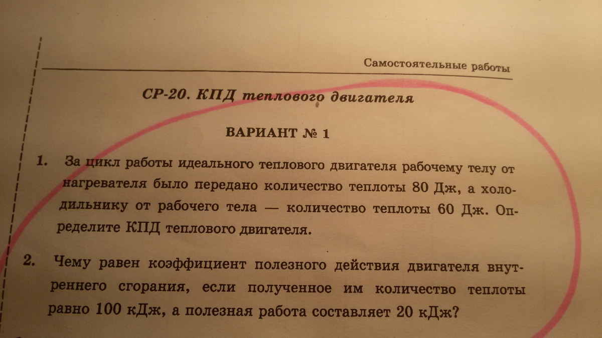 за цикл работы идеального теплового двигателя рабочему телу от нагревателя было передано количество теплоты 80 Дж, а холодильнику от рабочего тела-количество теплоты 60 Дж. Определите КПД теплового двигателя.