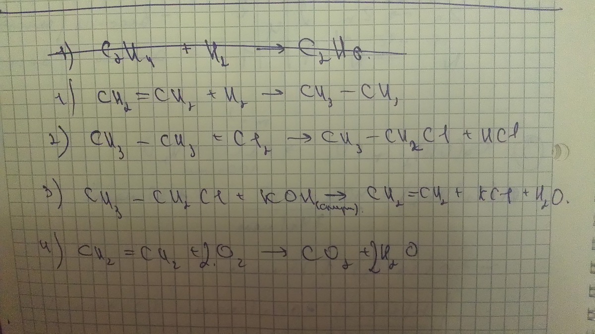 С2Н4-->C2H6-->C2H5Cl-->C2H4-->CO2