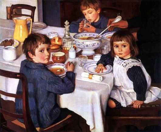 На картине Серебряковой "За обедом" мы видим троих детишек, которые трапезничают. Это дети художницы. Кажется, что перед нашим взором не картина, а фотография. Это происходит из-за того, что дети изображены в непринужденных позах. Девочка смотрит на маму, один мальчик допивает воду. Второй сын словно оглянулся на маму-художницу, которая его окликнула.