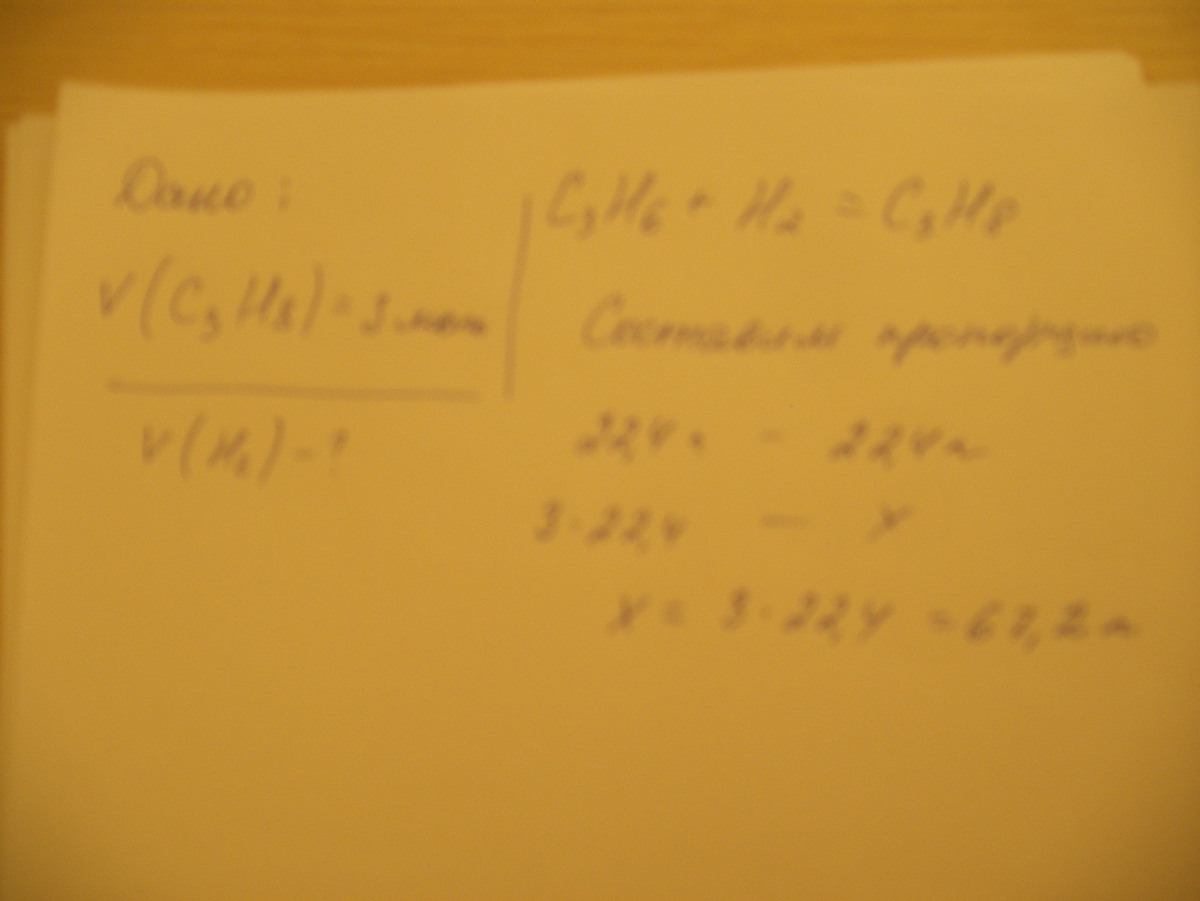 при взаимодействии пропилена с водородом образовалось 3 моль пропана. Определите объем вступившего в реакцию водорода.