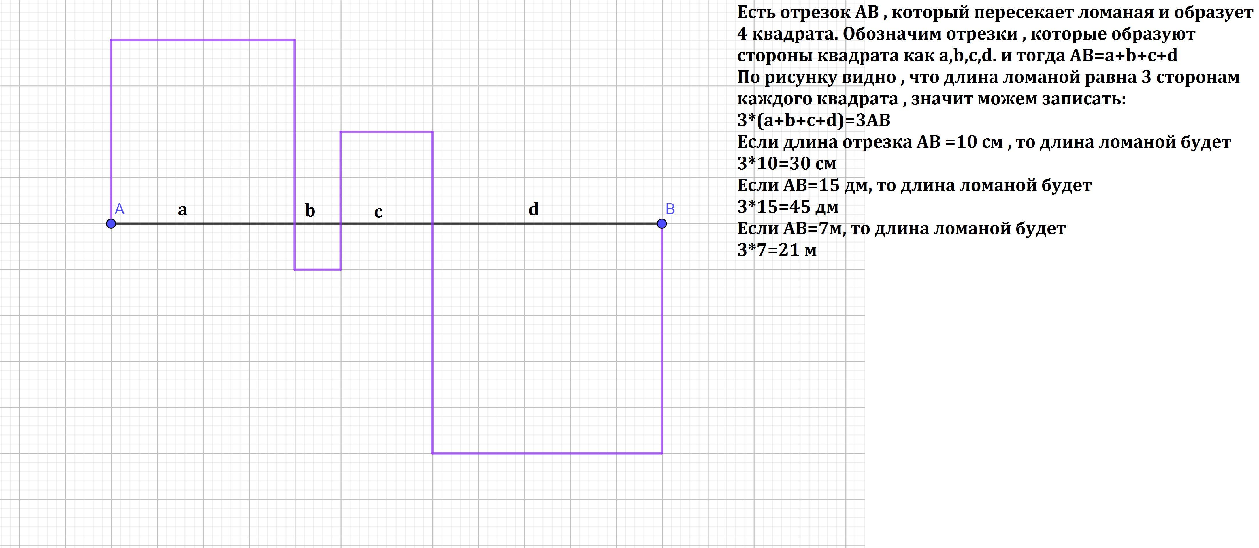 при пересечении отрезка АВ ломаной образовалось 4 квадрата определи длину этой ломаной если длина отрезка АВ равна : 1) 10см 2)15дм 3)7м