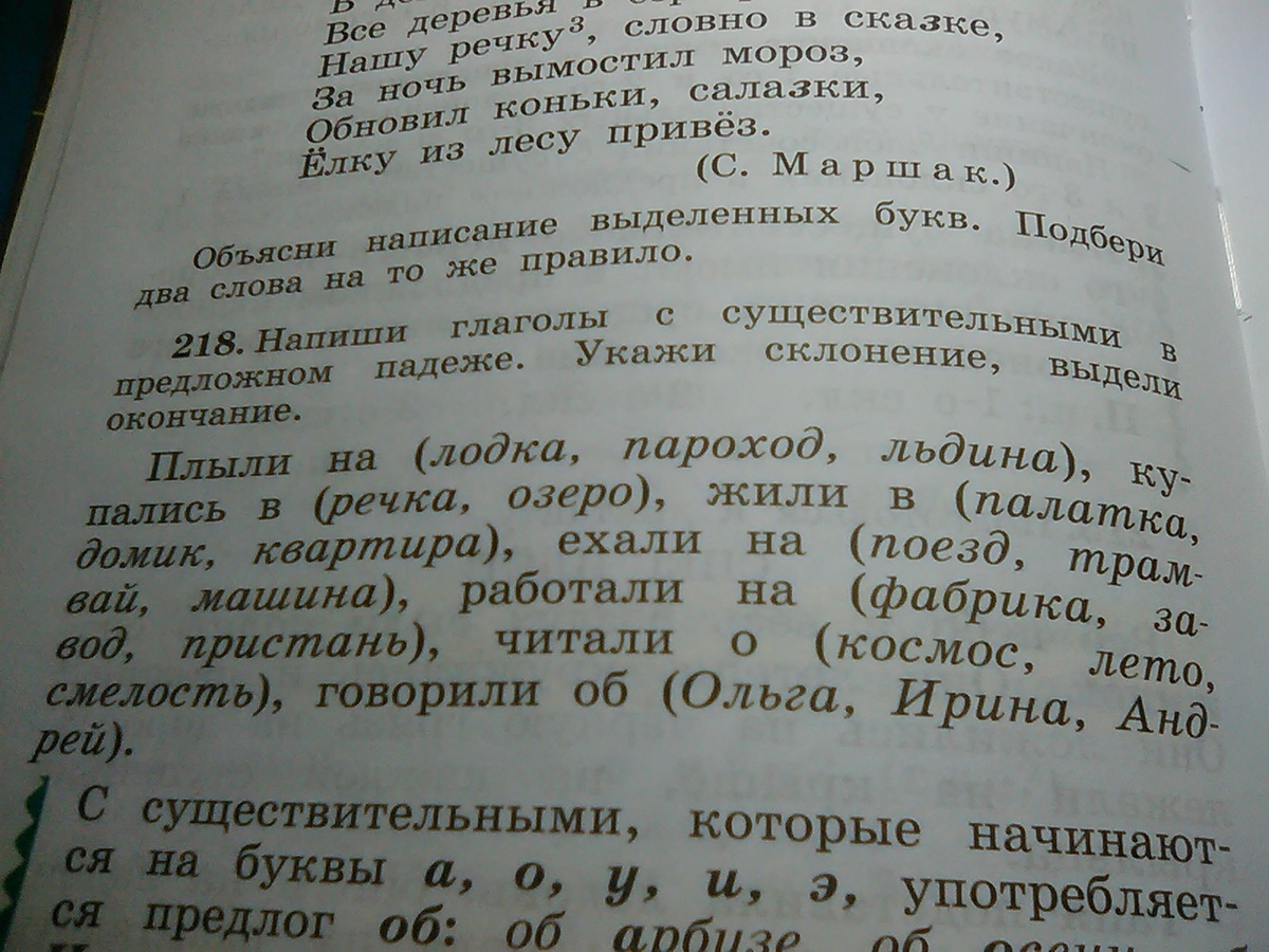 Плыли на лодке,плыли на пароходе,плыли на льдине.Купались в речке,купались в озере.Жили в палатке,жили в домике,жили в квартире.Ехали на поезде,ехали на трамвае,ехали на машине.Работали на фабрике,работали на заводе,работали на пристани.Читали о космосе,читали о лете,читали о смелости.Говорили об Ольге,говорили о Ирине,говорили о Андрее.
