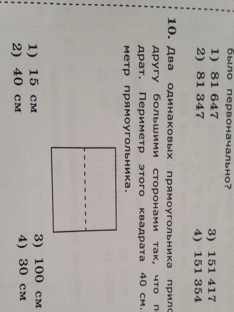 40:4=10см сторона квадрата и соответственно одна сторона прямоугольника