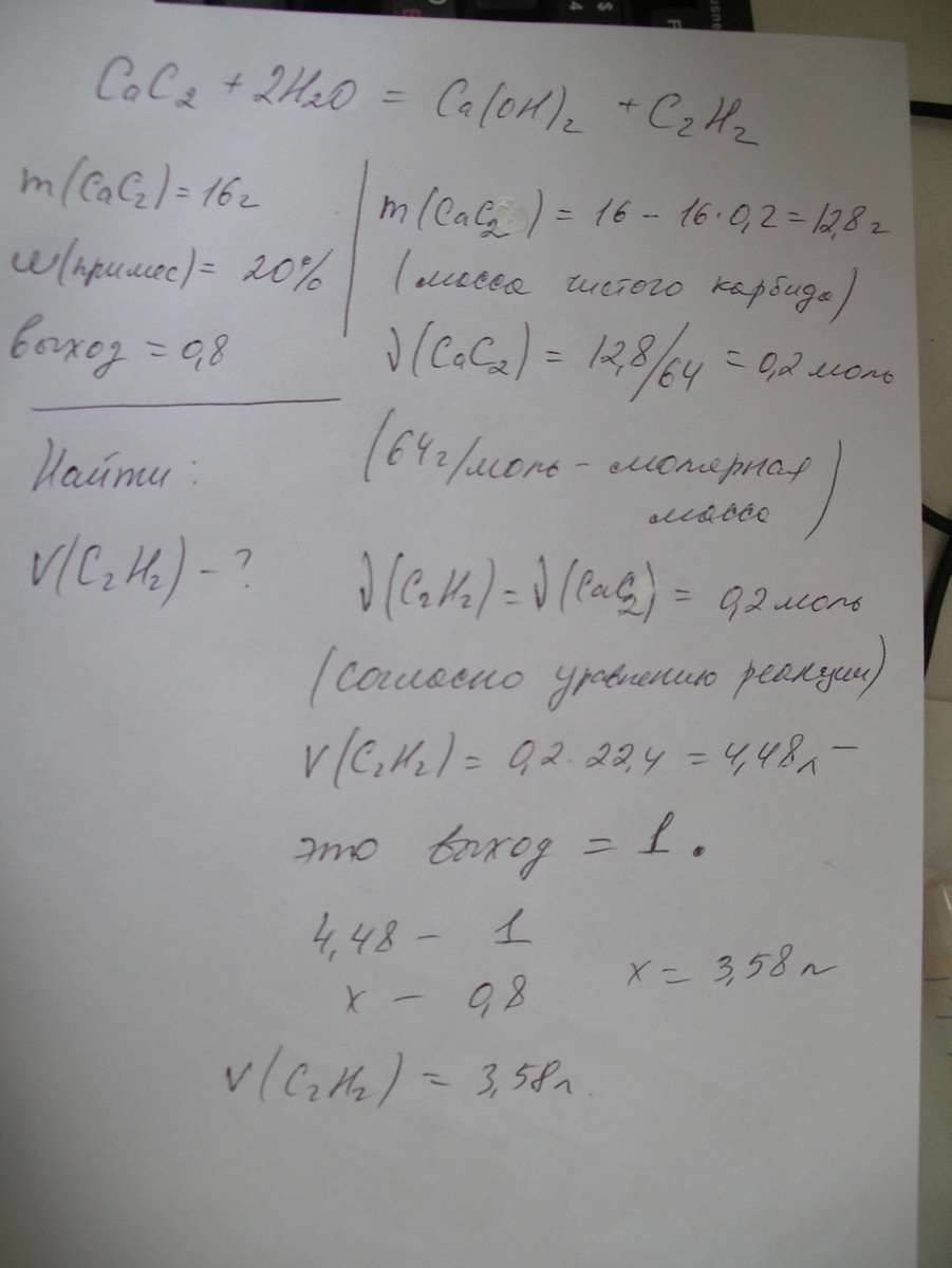 Образец технического карбида массой 16 г обработали избытком воды. Определить объем газа(н.у.), который при этом выделиться, если массовая доля примесей в карбиде кальция составляет 20%, а объемное отношение практическкого выхода равно 0.8