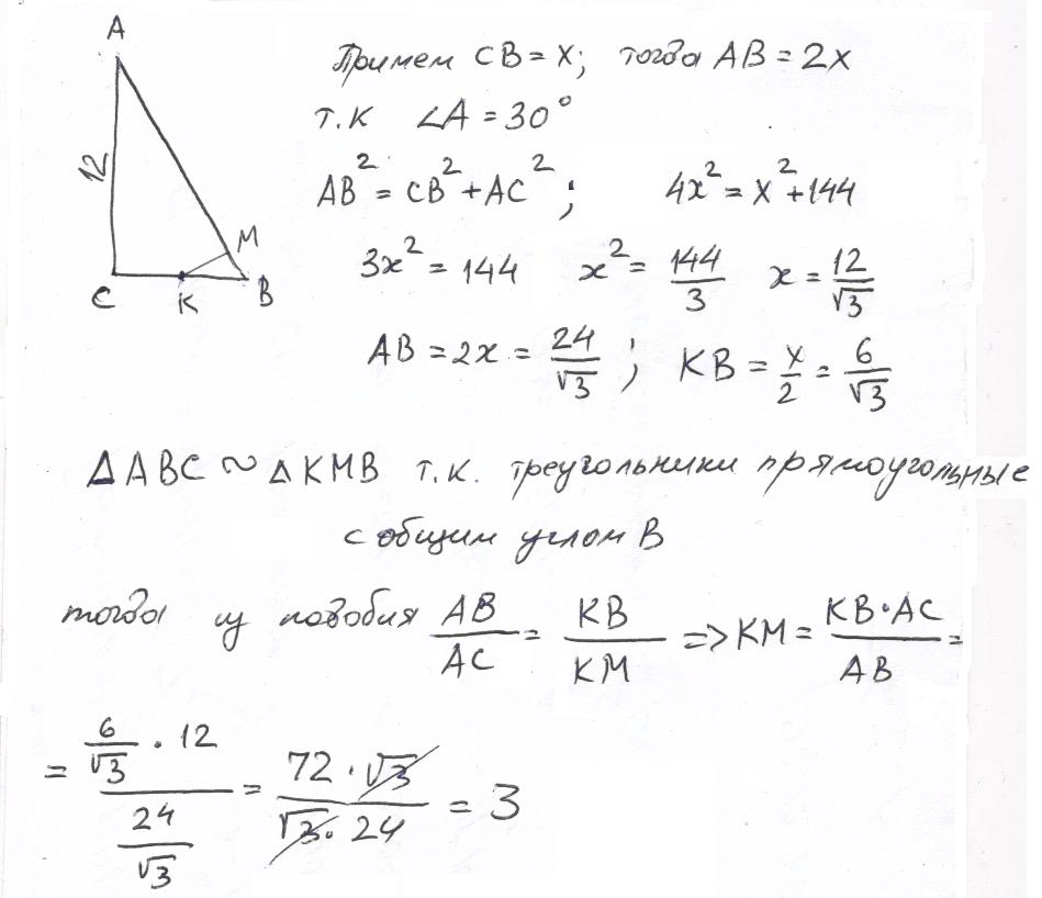 В треугольнике ABC угол C=90 градусов,угол В=60 градусов,АС=12см,точка К -середина стороны ВС.Найдите расстояние от точки К до гипотенузы АВ.