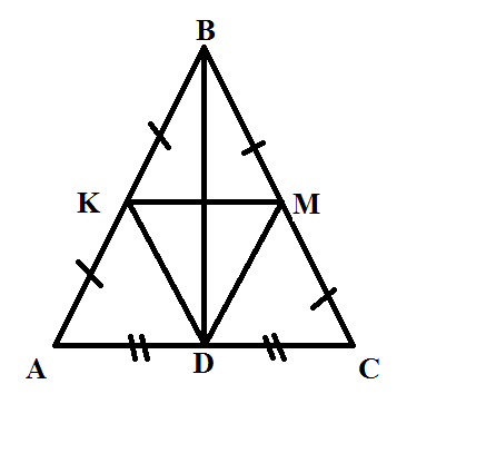В равнобедренном треугольнике АВС точки К и М являются серединами боковых сторон АВ и ВС соответственно. ВD – медиана треугольника.