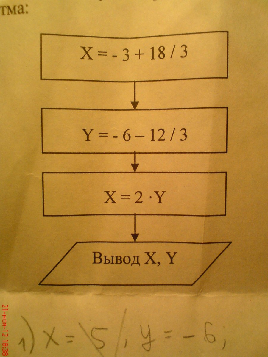 Задание: какие значения получат переменные X и Y после выполнения следующего алгоритма ( на фотографии ).