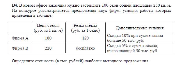 В новом офисе заказчика нужно застеклить 100 окон общей площадью 250 кв. м. На конкурсе рассматривается предложения двух фирм, условия работы которых приведены в таблице