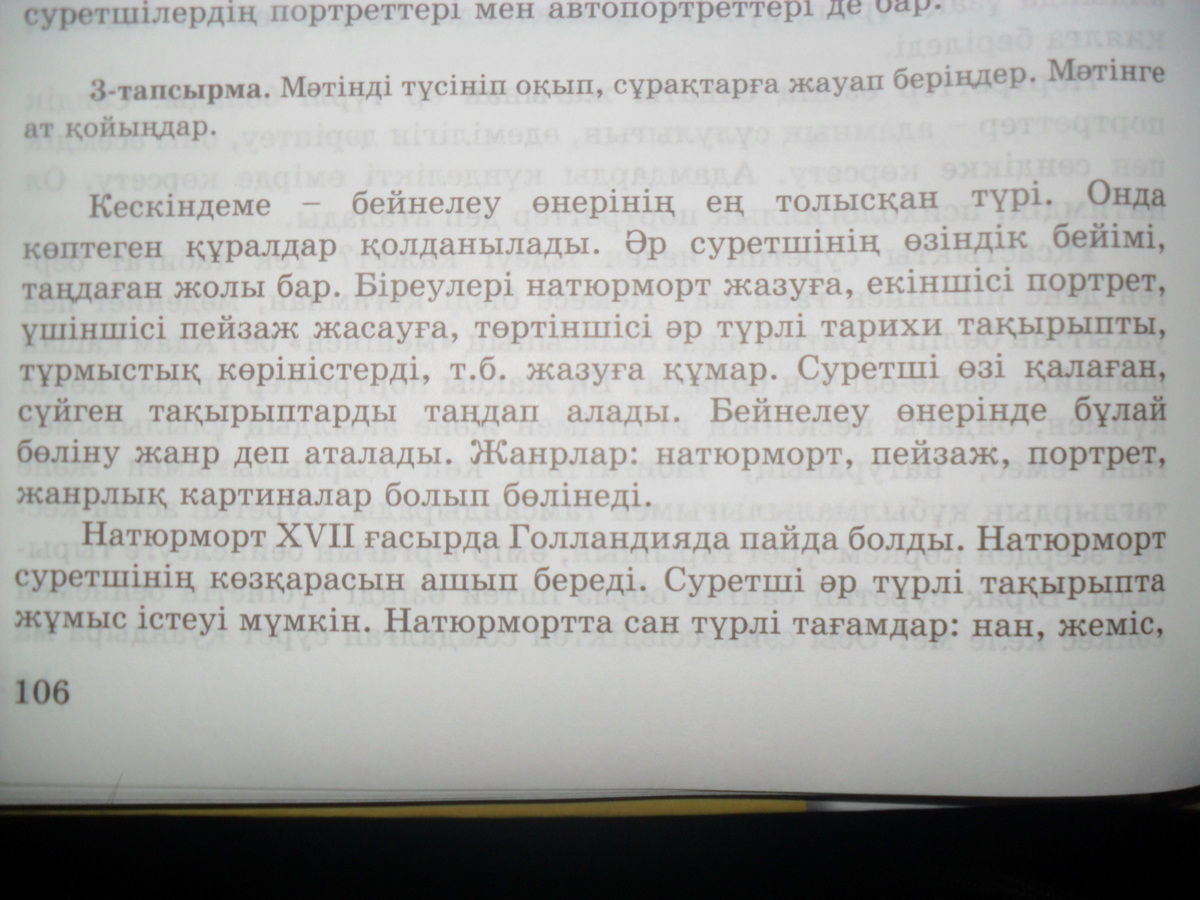 Кескіндеме - бейнелеу өнерінің ең толысқан түрі. Әр суретшінің өзінің таңдаған жолы бар. Біреуі табиғат, біреуі тарихи көріністерді бейнелеуге құмар болады. Бейнелеу өнерінде бұндай бөлінуді жанр дейді. Жанрлар натюрморт, пейзаж, портрет, жанрлық картиналар болып бөлінеді.