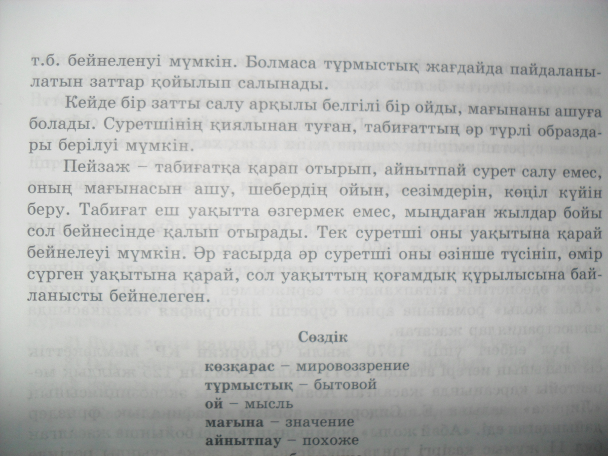 Пейзаж - табиғаттың көрінісі. Табиғат өмірде көп өзгермей, мыңдаған жылдар бойы бір қалыпта қала берсе де, суретші оның кейпін өз көзқарасына, ойына байланысты өзгертіп бейнелеуі мүмкін. Пейзаж арқылы суретші өзі сүрген уақыттың тұрмысын, қоғамдық құрылысына дейін көрсете білген.