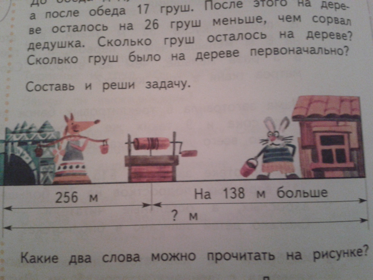 От дома Лисы до колодца 256 м, а от избушки Зайца до колодца на 138 м больше. Сколько метров от дома Лисы до избушки Зайца?