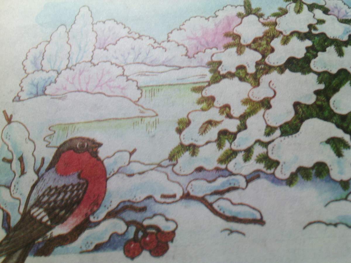 Прийшла зима. Білими шапками вкриті всі дерева. Здаєтся що під снігом нікого немає, така навкруги стоїть тиша. Але це далеко не так. Маленьки комахи, польові миші ховаються у теплих норках. Одинокий снігур сидить на гілочці горобини. Невелика річка вже замерзла. Нарешті прийшла справжня зима.І лише поодинока красуня-ялинка зачаровано дивиться на це диво природи.