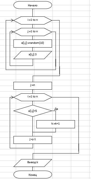 Составьте блок схему алгоритма и программу вычисления в матрице B количествах элемента меньше 5 состоящих на побочной диагонала. Помогите написать проурамму!!!!