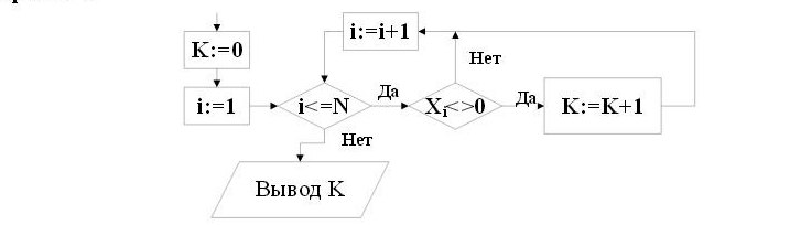 Задан одномерный массив Х={Х1, Х2, …, Хn}. Определить, что подсчитывает представленный фрагмент алгоритма.