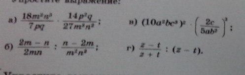 1); frac{18m^2n^3}{7pq}cdot frac{14p^2q}{27m^3n^2}=frac{4np}{m}\\2); frac{2m-n}{2mn}:frac{}n-2m{}m^2n^2=frac{(2m-n)cdot m^2n^2}{2mncdot (n-2m)}=-frac{mn}{2}\\3); (10a^2bc^3)^2cdot (frac{2c}{5ab^2})^3=frac{100a^4b^2c^6cdot 8c^3}{125a^3b^6}=frac{32ac^9}{5b^4}\\4); frac{z-t}{z+t}:(z-t)=frac{z-t}{(z+t)(z-t)}=frac{1}{z+t}