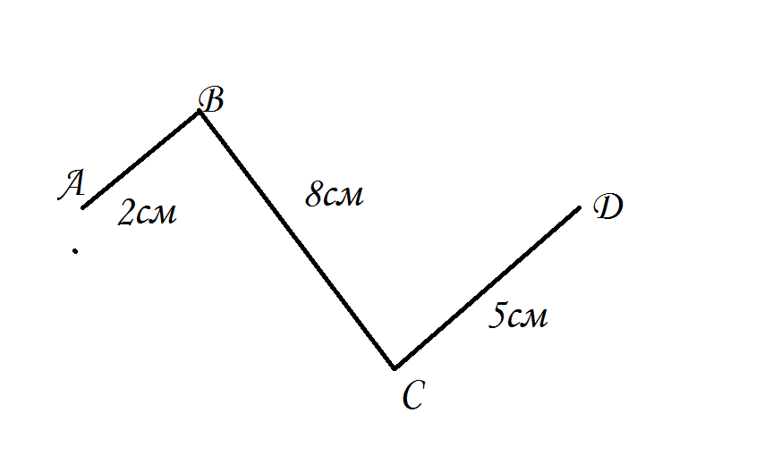 начертите ломаную из 3 звеньев у которой длина первого звена 2 см второго звена в 4 раза больше а третьего на 3 см меньше второго . найди длину ломаной.