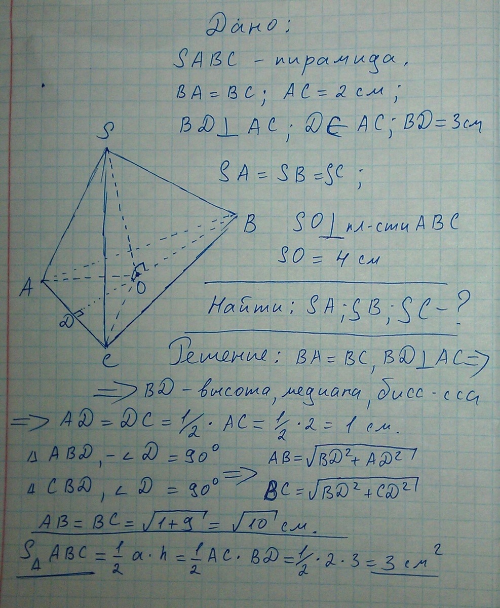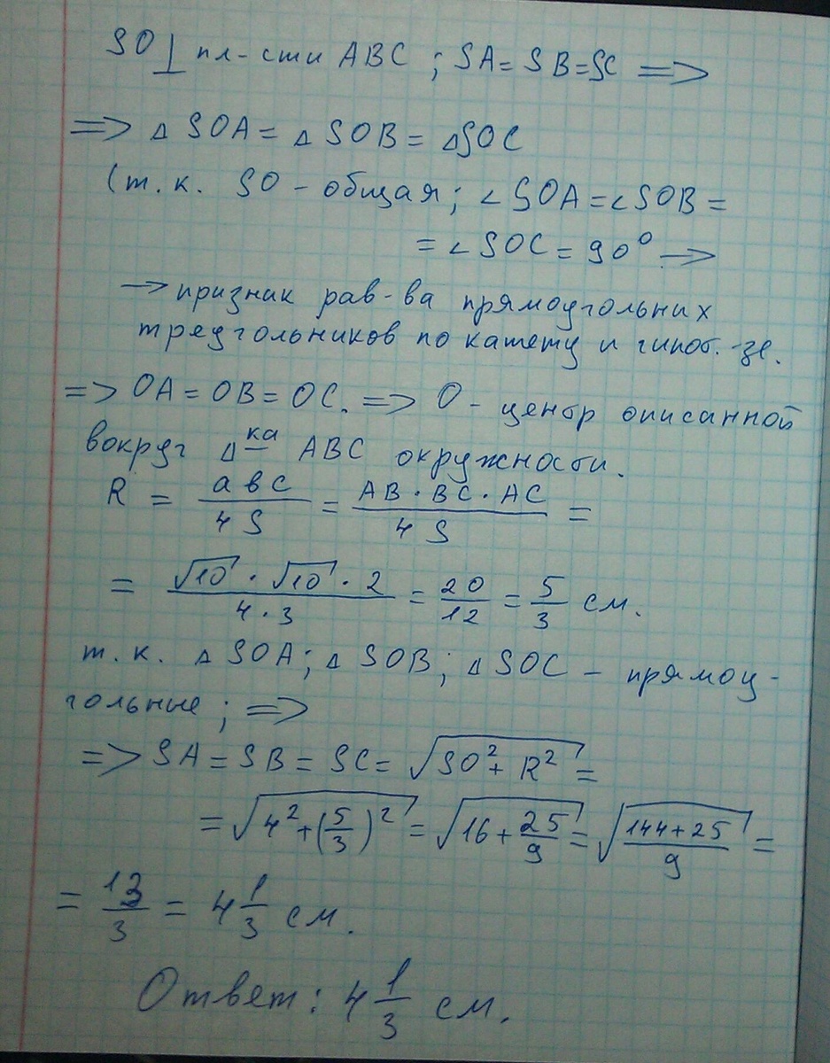 Основание пирамиды - равнобедренный треугольник, основание которого равно 2 см, а высота, проведенная к его основанию, равна 3 см.Все боковые ребра пирамиды равны друг другу, а ее высота равна 4 см.Вычислите длину бокового ребра пирамиды.