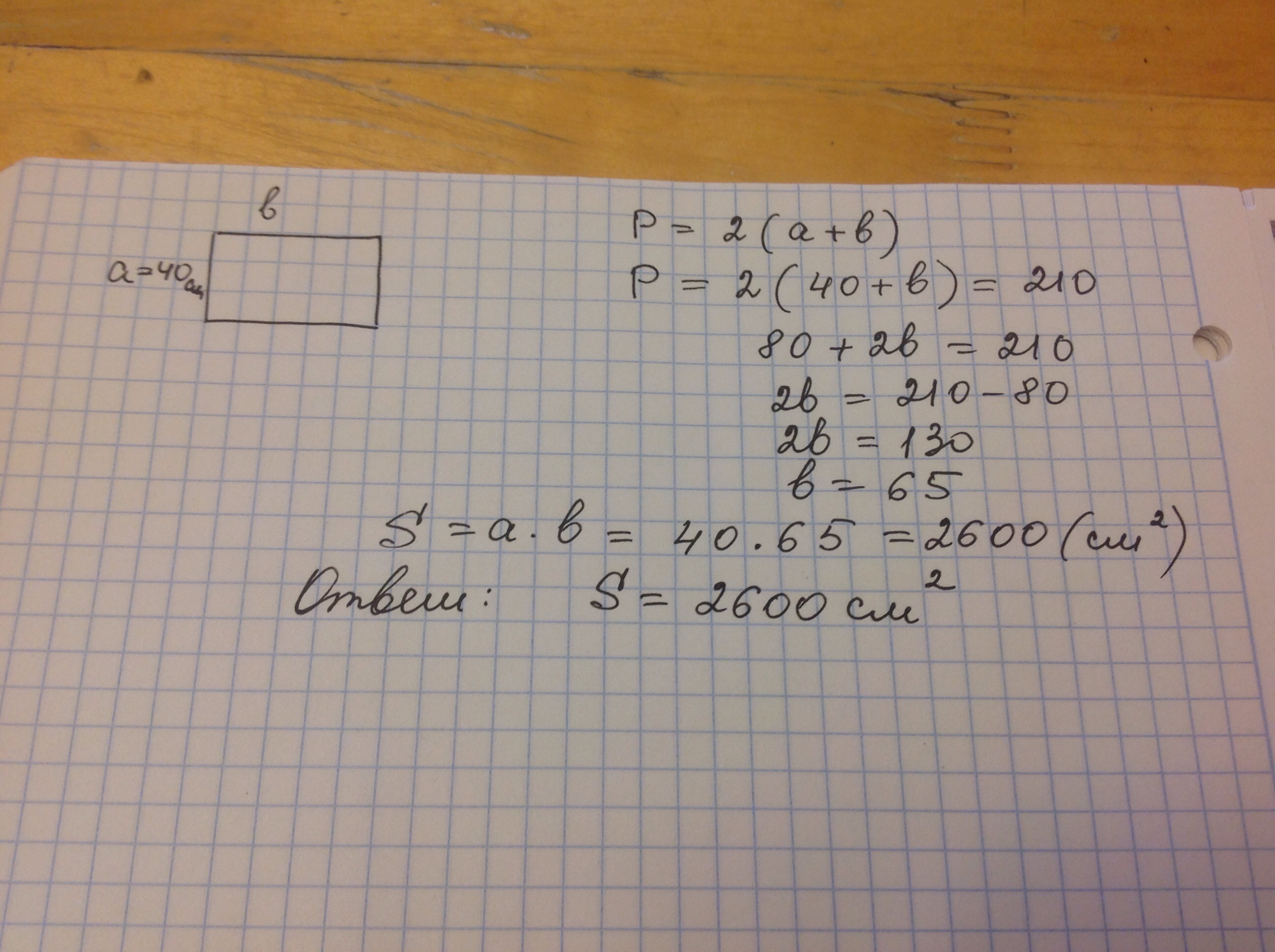 решить задачу по математики 4 класс .Одна сторона прямоугольника равна 40см, а его периметр 210см.Вычисли площадь прямоугольника