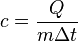 — удельная теплоёмкость, — количнство теплоты, полученное веществом при нагреве (или выделившееся при охлаждении), — масса нагреваемого (охлаждающегося) вещества, — разность конечной и начальной температур вещества.
