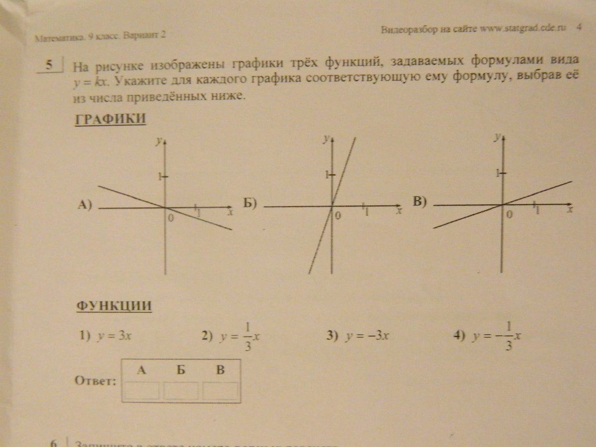 На рисунке изображены графики трёх функций, задаваемых формулами вида y=kx. Укажите для каждого графика соответствующую ему формулу, выбрав её из числа приведённых ниже.