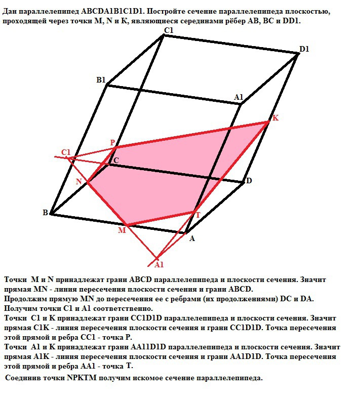 Дан параллелепипед АВСDA1B1C1D1. Постройте сечение параллелепипеда плоскостью, проходящей через точки М, N и К, являющиеся серединами рёбер АВ, ВС и DD1.