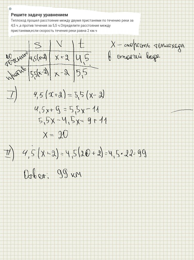 Теплоход прошел расстояние между двумя пристанями по течению реки за 4,5 ч ,а против течения за 5,5 ч.Определите расстояние между пристанями,если скорость течения реки равна 2 км.ч