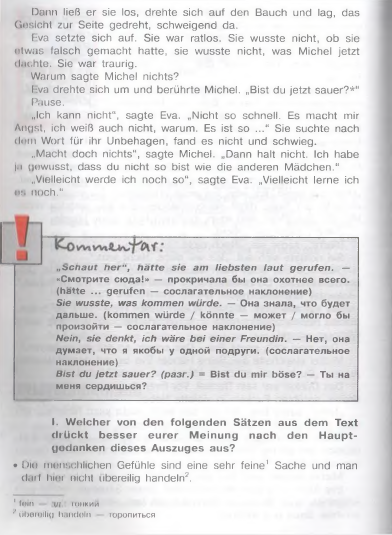 "Твоя мама знает, что ты со мной?" спрасил Михаель. "Нет,она думает, что я якобы у одной подруги." Они легли рядом друг к другу на траве, вплотную друг к другу. Ева была беззащитна под ласками Михаеля, его дыхание около ее горла, его руки.