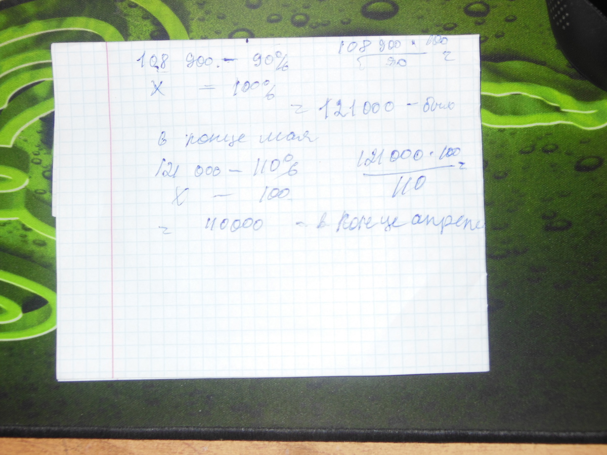 решите задачу. Банковский вклад в мае увеличился на 10%, а в июне уменьшился на 10%, после чего на счету оказалось 108900 рублей. Найдите сумму вклада
