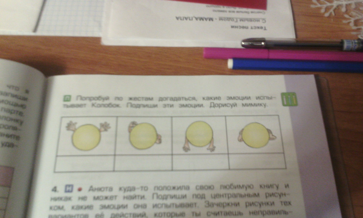 Попробуй догадаться какие эмоции испытывает Колобок. Подпиши эти эмоции. Дорисуй мимику.