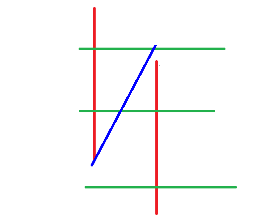 побудуй 2 вертикальні прямі червоного кольору, 1 похилу - синього та 3 горизонтальні зеленого кольору