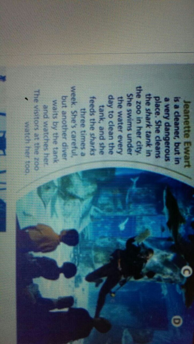 Жанетт Эворт уборщица, но в очень опасном месте. Она убирает аквариум акул в зоопарке в своем городе. Она плавает под водой каждый день, чтобы очистить аквариум (бак), и она кормит акул три раза в неделю. Она осторожна, но другой водолаз ждет около аквариума и наблюдает за ней. Посетители зоопарка тоже смотрят на нее