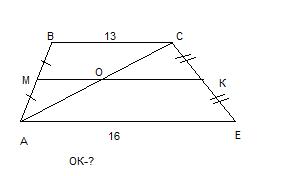 Рассмотрим треугольник АСЕ. Здесь ОК - средняя линия треугольника, т.к. соединяет середины сторон. Докажем, что это действительно так: