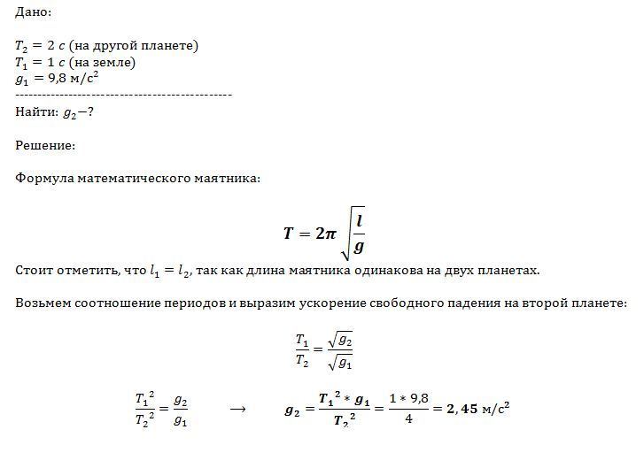 На некоторой планете период колебаний секундного земного математического маятника оказался равным 2 секунд. Определите ускорение свободного падения на этой планете