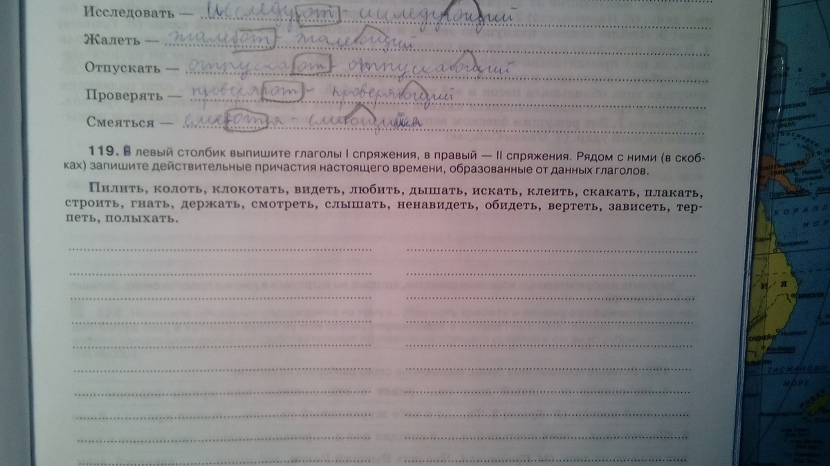 глаголы 2 спряжения : пилить (пиляющий), колоть (колющий),клокотать (клокочущий), любить (любящий), дышать (дышущий), искать (искающий), клеить (клеющий), скакать (скачущий), плакать (плачущий), строить (строющий), гнать (гонящий), держать (держащий), слышать (слышущий), полыхать (полыхающий)
