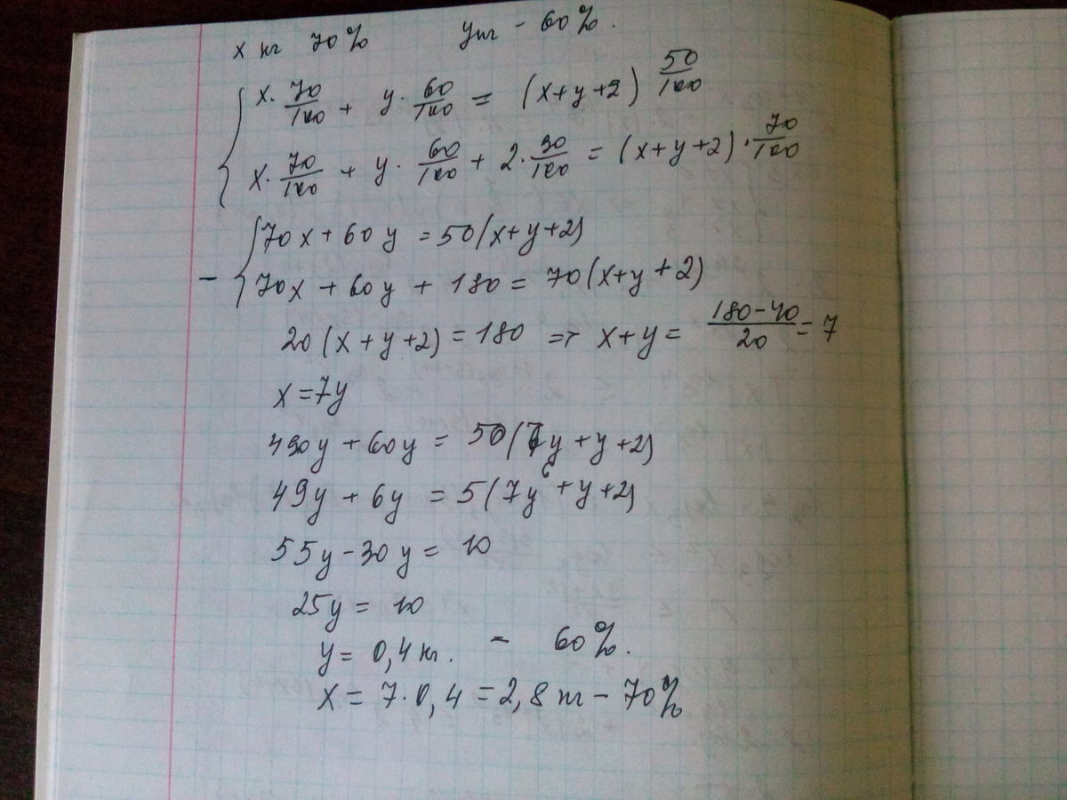Смешали 70% и 60% растворы кислоты и добавив 2 кг чистой воды получили 50% раствор кислоты. Если бы вместо 2 кг воды добавили 2 кг 90% ратвора той же кислоты, то получили бы 70 % раствор кислоты. Сколько килограммов 70% раствора использовали для получения смеси?