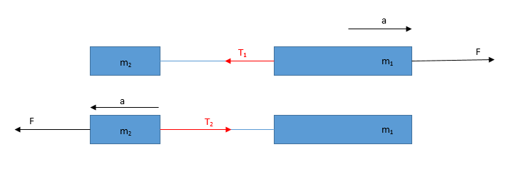 два бруска массами m1=5 кг и m2=4 кг, соединенные нитью, лежат на гладком столе. С каким ускорением будут двигаться бруски, если к одному из них приложить силу F=10H,направленную горизонтально? Какова будет сила натяжения T нити, соединяющей бруски, если силу приложить к первому бруску? ко второму бруску?