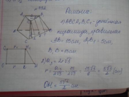 Найдите апофему и высоту правильной усеченной треугольной пирамиды, у которой стороны оснований равны 15 см и 5 см, а боковое ребро - 13 см.