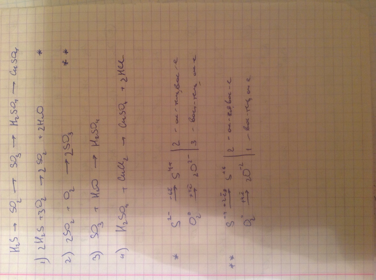 нужно написать уравнения реакций с помощью которых можно осуществить цепочки превращений веществ: Сероводород-оксид серы 4-оксид серы 6-серная кислота-сульфат меди 2, и к уравнениям овр составить схему эл.баланса