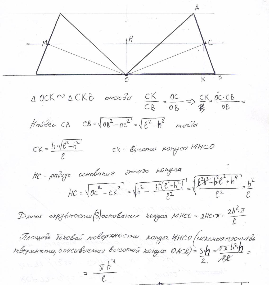 Конус катится по плоскости вокруг неподвижной вершины.найдите площадь поверхности ,описываемой высотой конуса,если его образующая равна l, а высота h.